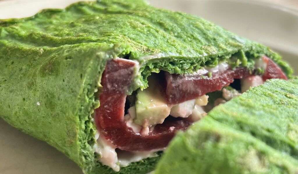 zeer dun gesneden plakjes biet erop. Dan komt de avocado en verkruimelde feta erbovenop.